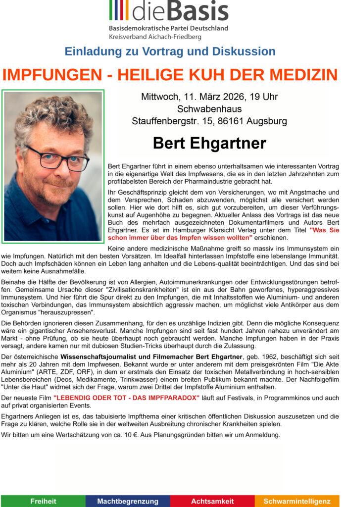 Bert Ehgartner führt in einem ebenso unterhaltsamen wie interessanten Vortrag in die eigenartige Welt des Impfwesens, die es in den letzten Jahrzehnten zum profitabelsten Bereich der Pharmaindustrie gebracht hat. Ihr Geschäftsprinzip gleicht dem von Versicherungen, wo mit Angstmache und dem Versprechen, Schaden abzuwenden, möglichst alle versichert werden sollen. Hier wie dort hilft es, sich gut vorzubereiten, um dieser Verführungskunst auf Augenhöhe zu begegnen. Aktueller Anlass des Vortrags ist das neue Buch des mehrfach ausgezeichneten Dokumentarfilmers und Autors Bert Ehgartner. Es ist im Hamburger Klarsicht Verlag unter dem Titel „Was Sie schon immer über das Impfen wissen wollten“ erschienen.