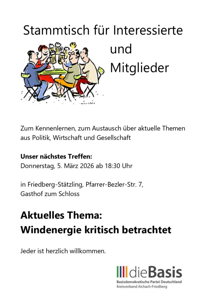 Nächster Stammtisch-Termin: Donnerstag, 5. März 2026, Gasthof zum Schloss (oder Schlossgaststätte), Pfarrer-Bezler-Str. 7, 86316 Friedberg/Stätzling